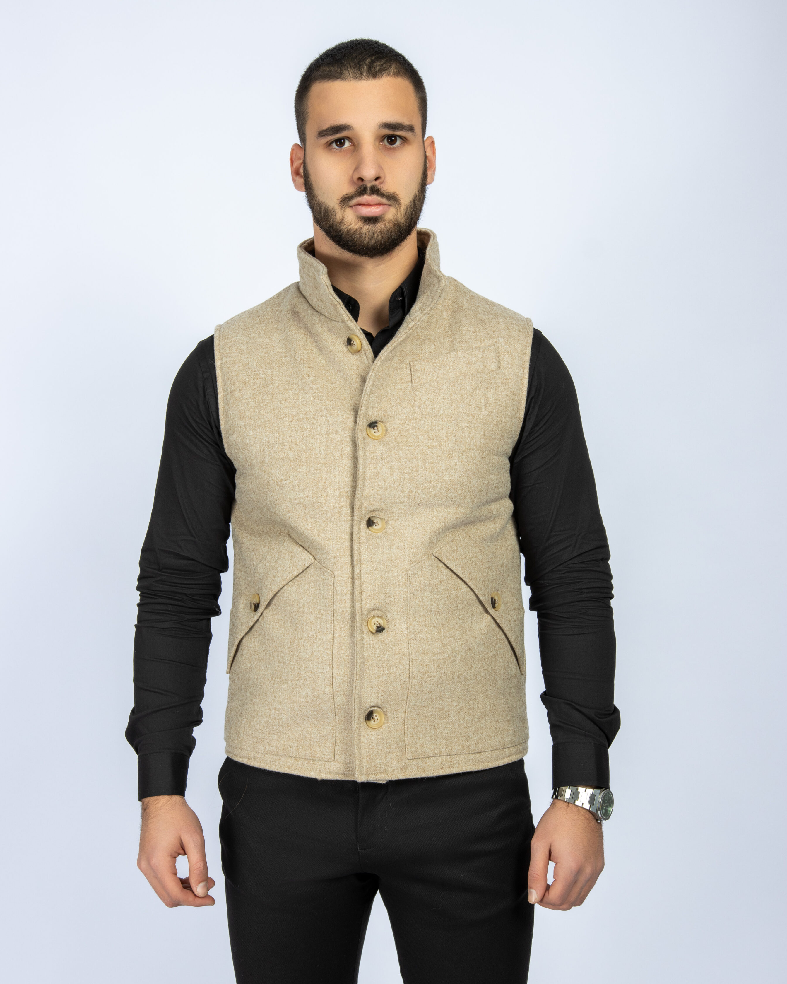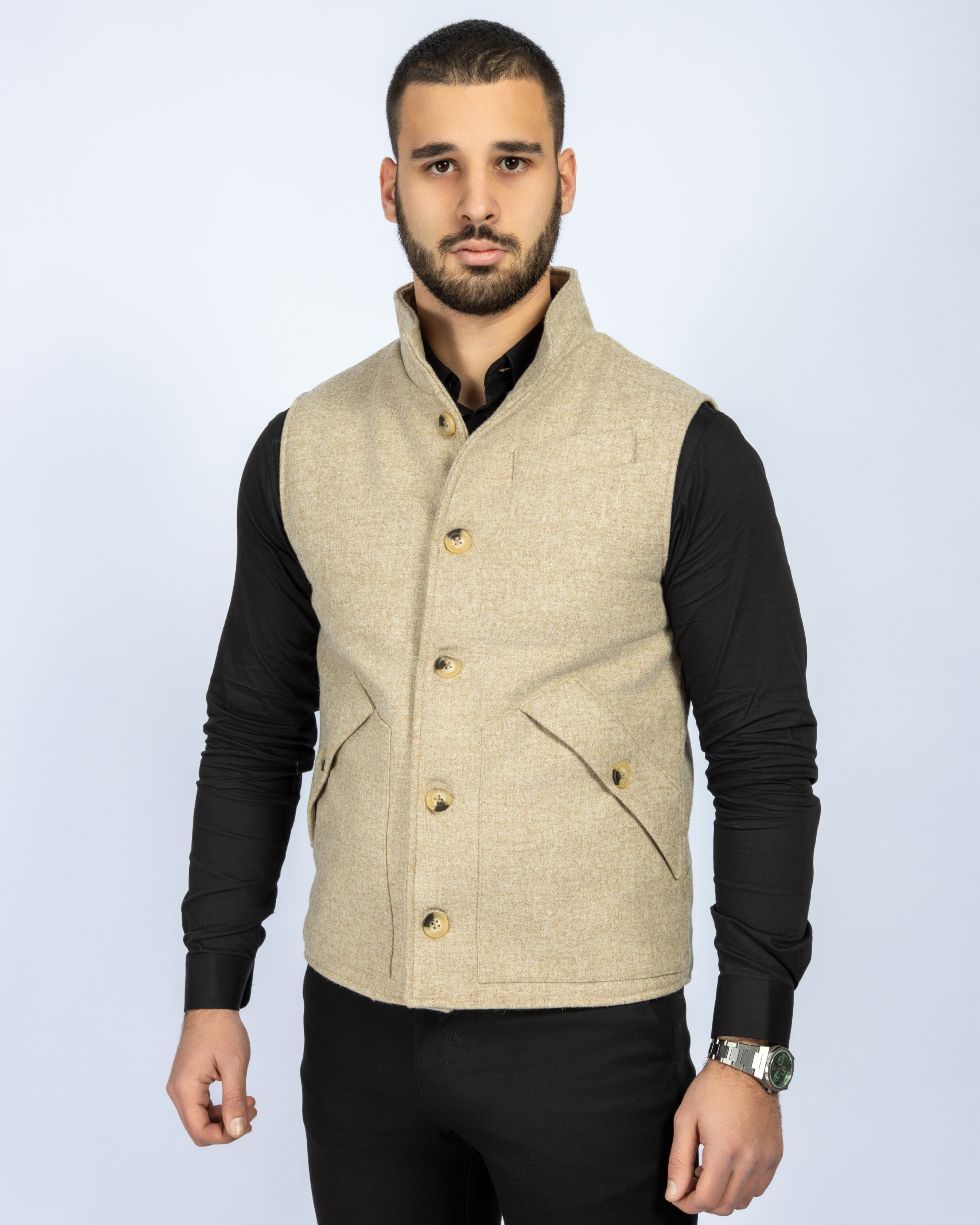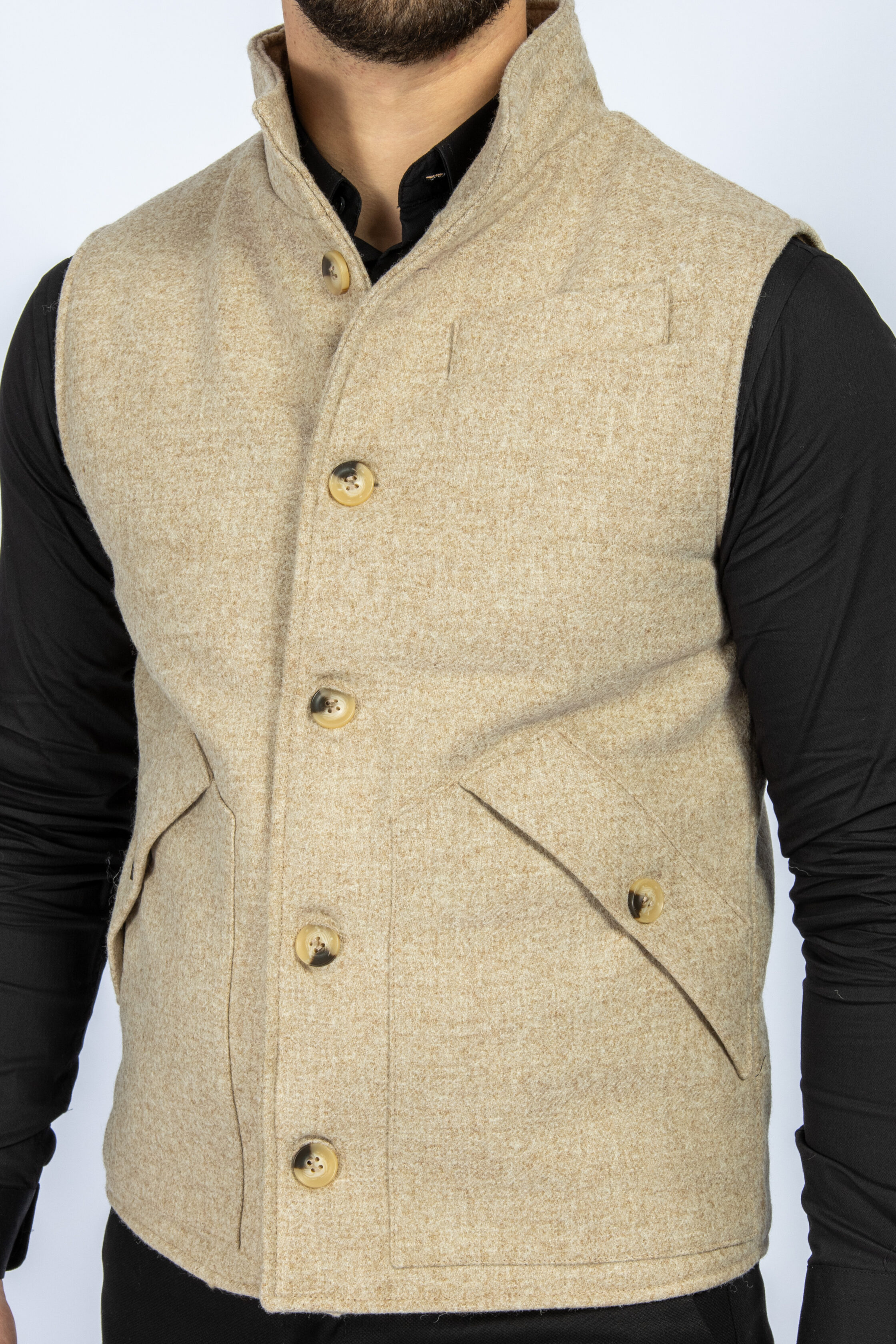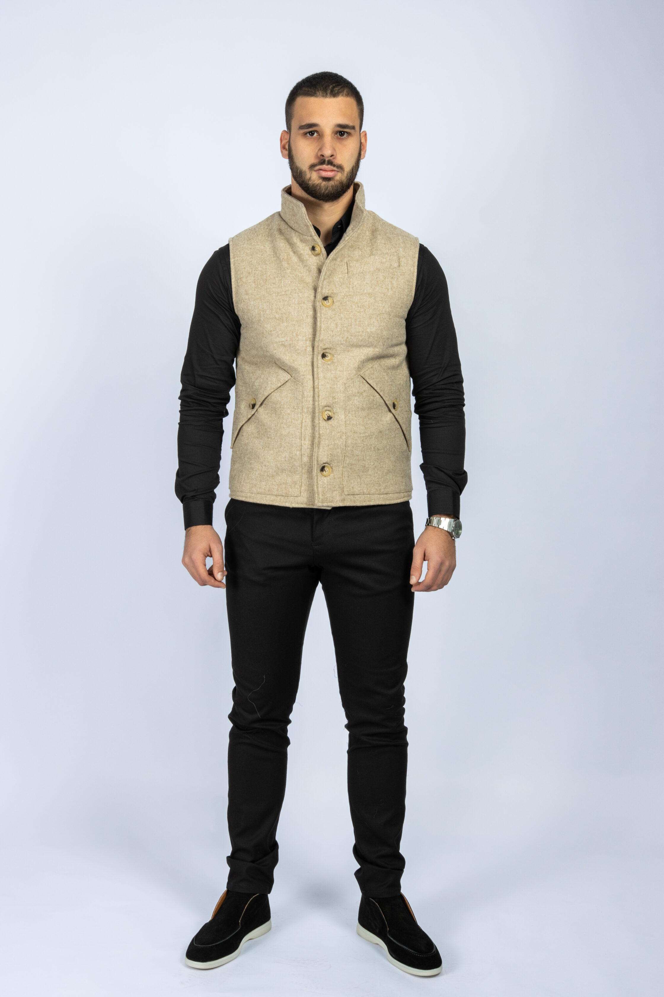 Regal Gentlemen’s Vest – Izrađen od najfinije italijanske vunene tkanine bež nijanse, ovaj izuzetni prsluk odiše sofisticiranošću i elegancijom. Regal Gentlemen’s Vest je pažljivo skrojen do savršenstva, obezbeđujući besprekorno pristajanje i udobnost. Podignite svoj stil odeće sa ovim luksuznim komadom, dizajniranim da ostavi utisak prefinjenog ukusa i besprekornog smisla za modu.